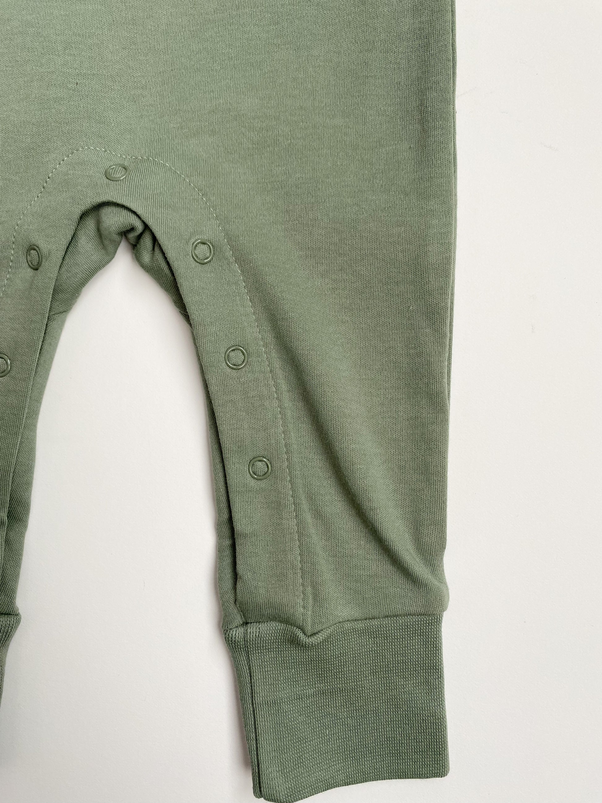The perfect spring and summer romper in a joyful green. Made of soft and sturdy organic cotton. Snaps on the pants make for easy diaper changes. Machine wash cold.