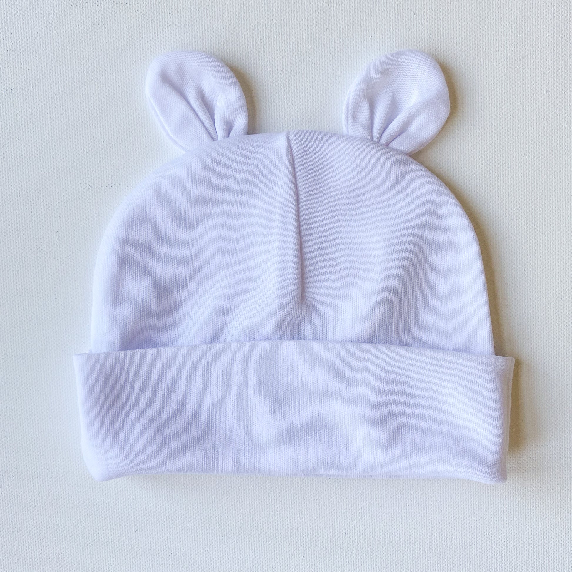 Newborn baby hat with bear ears! This sweet hat is perfect for the new baby in your life. Pair with a baby gown, swaddle and lovey for a perfect baby gift.