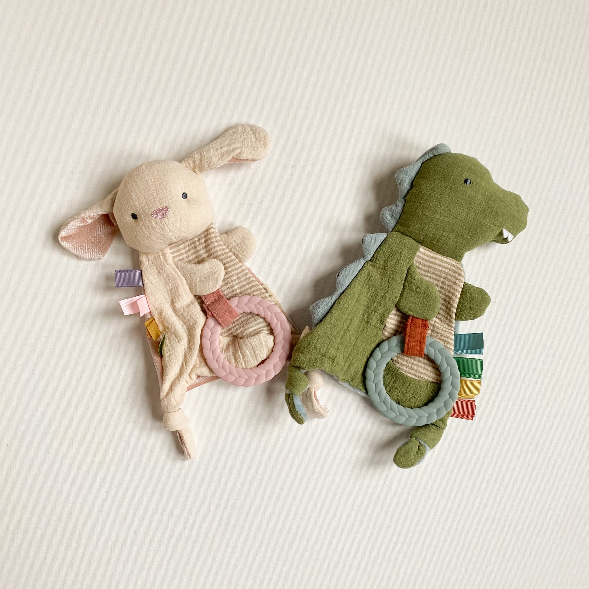 Meet Bitzy Crinkle™, a loveable sensory toy that crinkles and excites. With features like soft natural cotton fabric, textured ribbons and a braided teether, baby will love to explore this new friend. Watch as your little one is captivated by crinkles and giggles!