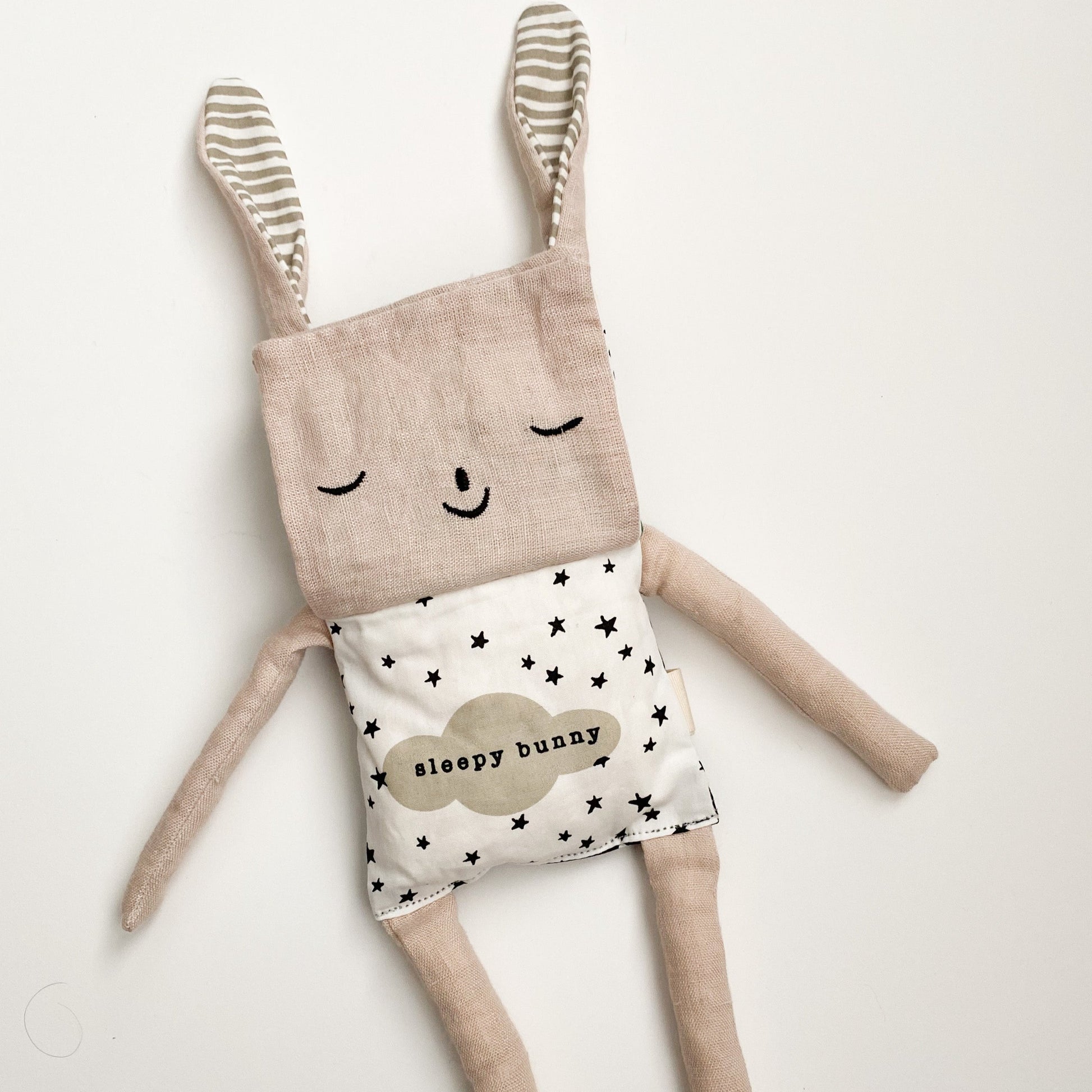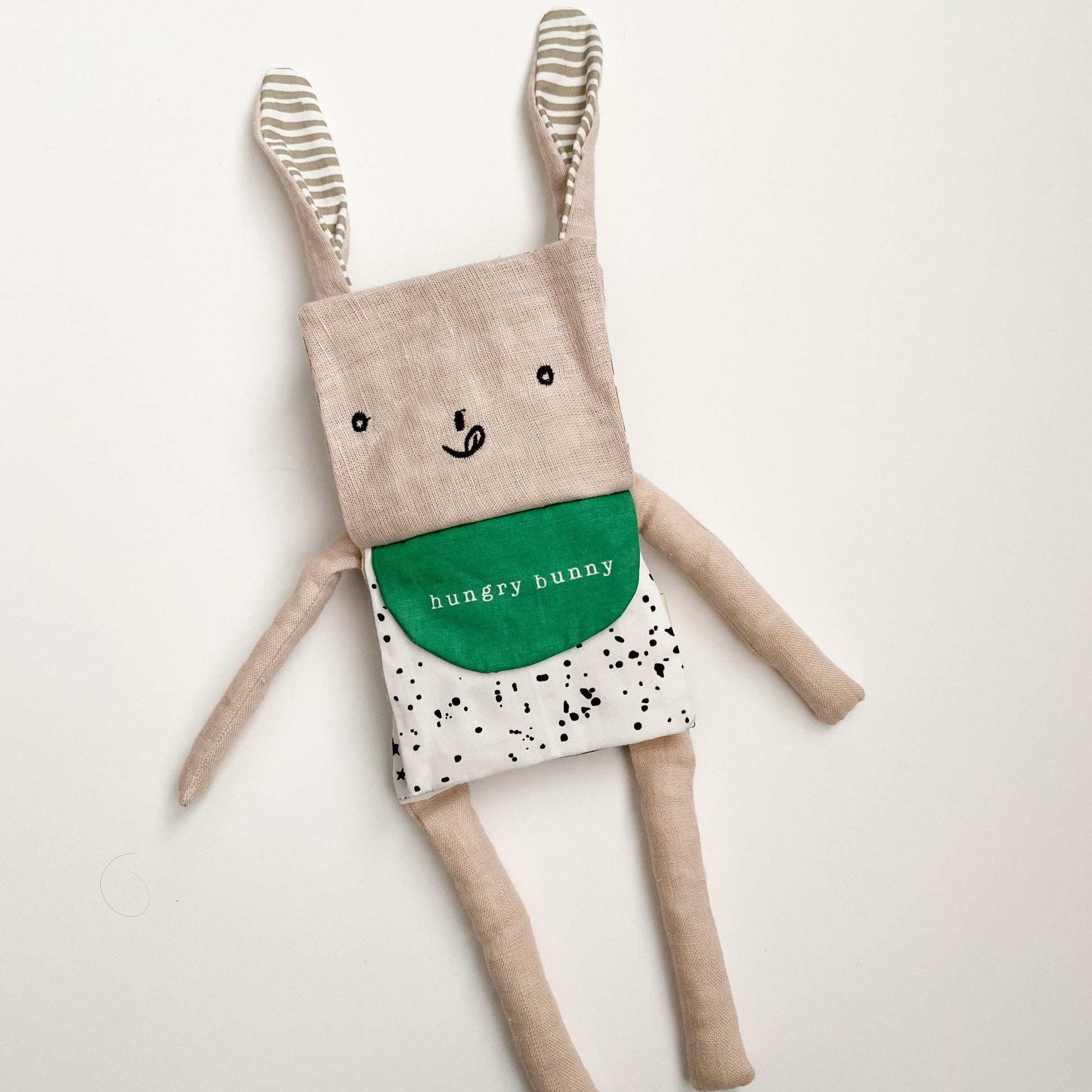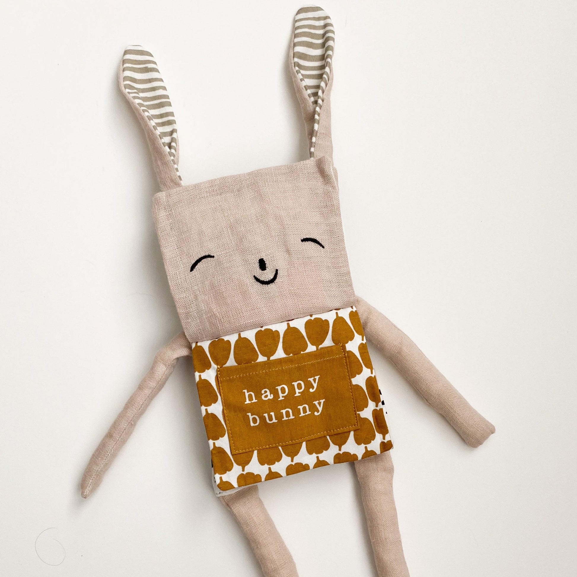 Soon to be your little one's best buddy, this bunny can go through the daily rhythms and moods with your kiddo. Simply flip the outfit up to reveal a new expression and fun print. Each face is embroidered and each outfit has lettering telling you the mood. A perfectly delightful toy for babies to big kids!