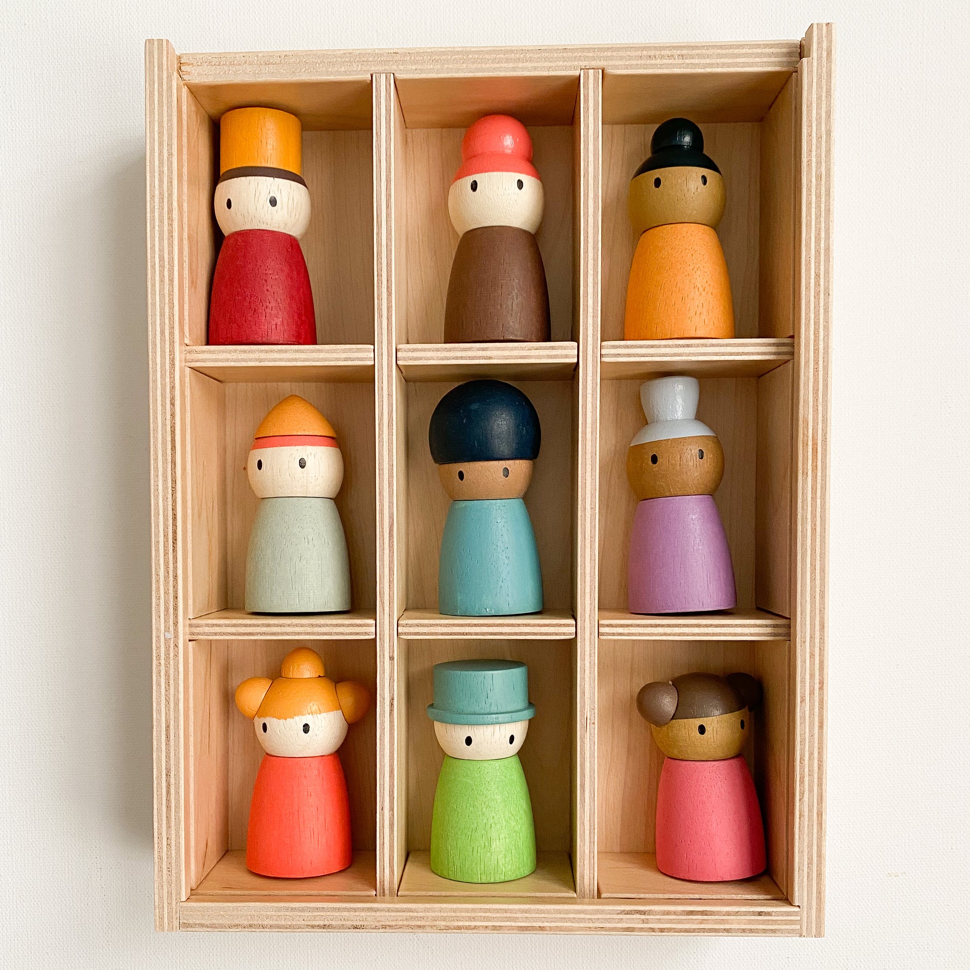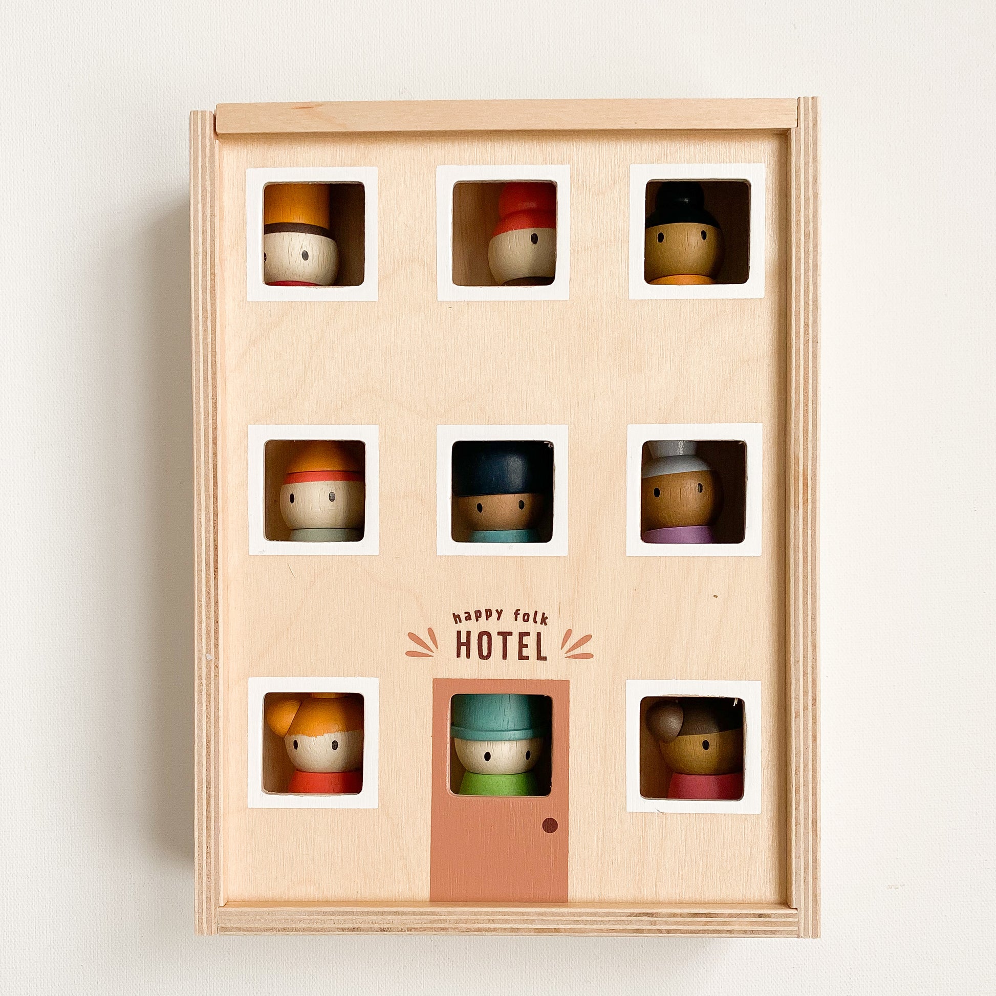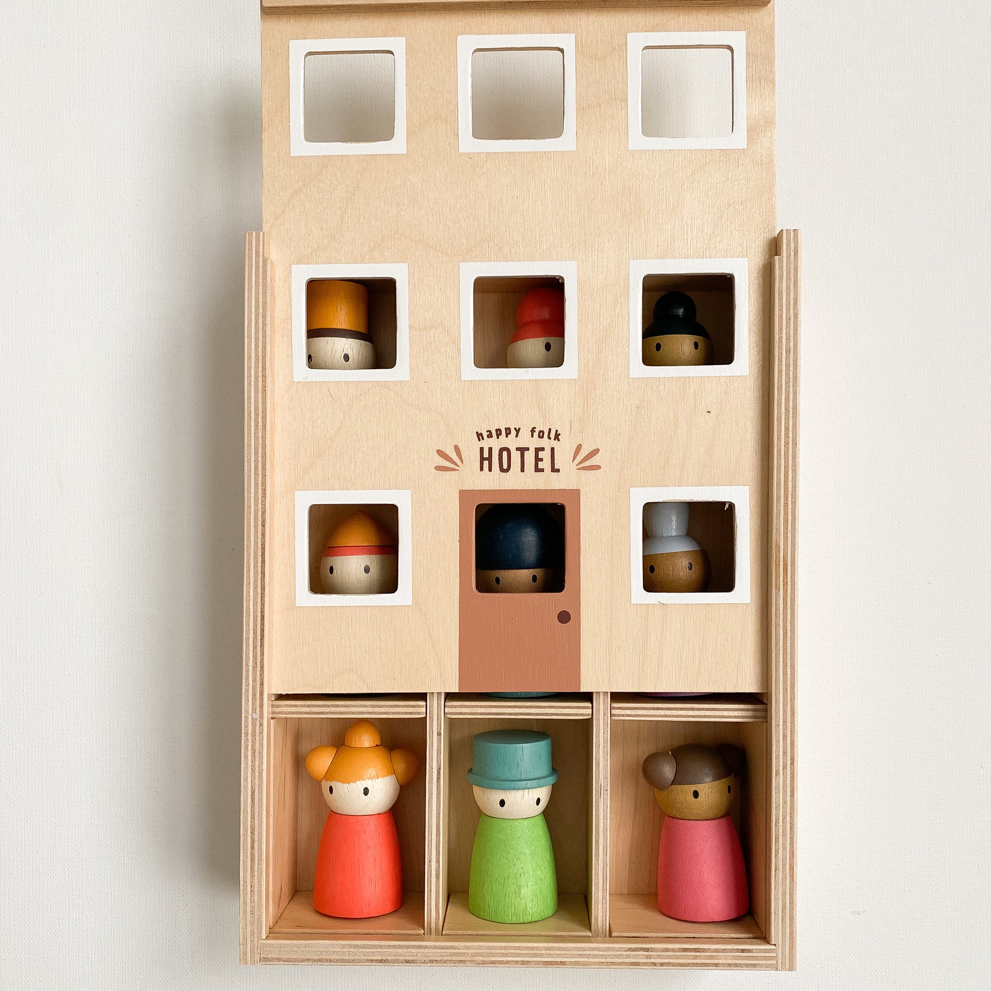 Open up the front panel of the hotel to see all the people! The wooden people are fun colors with adorable hairstyles and hats. These little people are perfect for adding to any sort of creative or imaginative play, and can be perched easily on any surface.