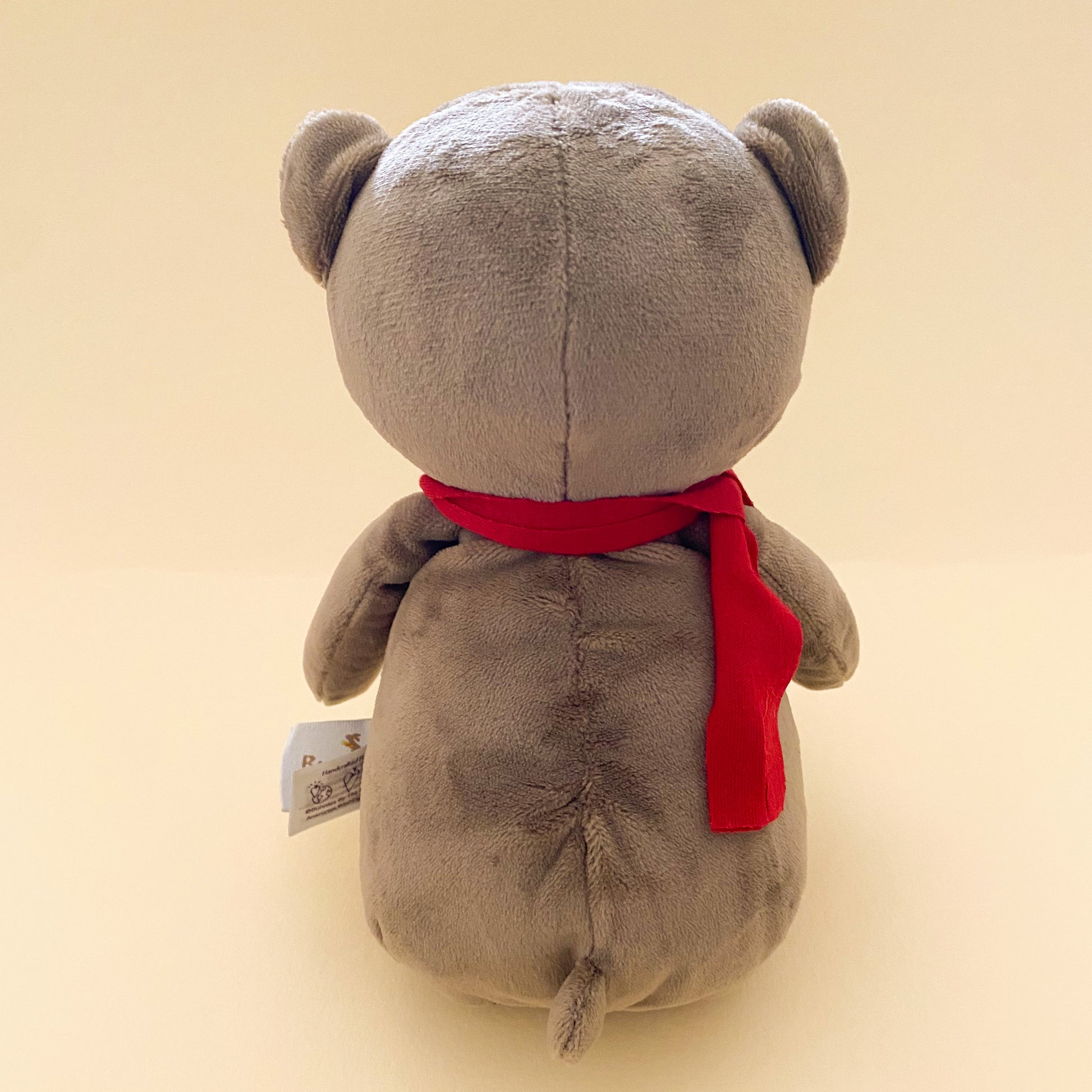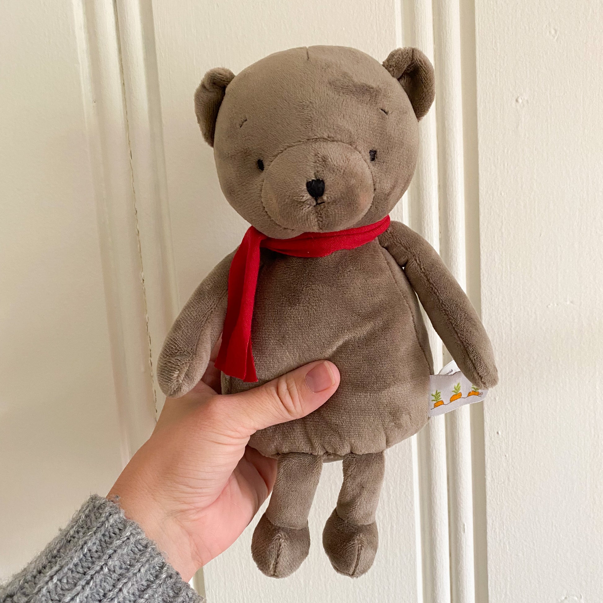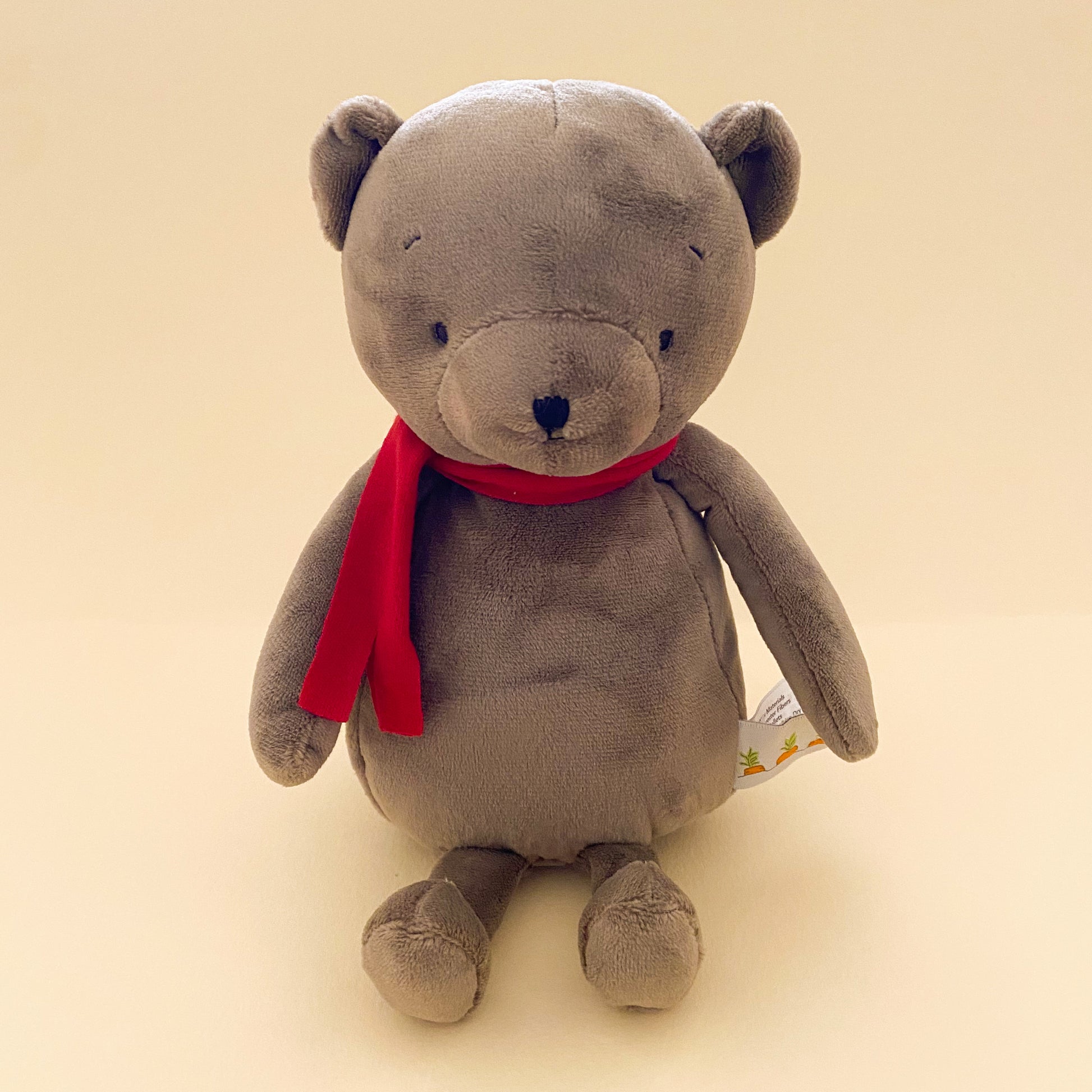 The sweetest Holiday teddy bear, "Brownie". He has a plump body and sweet hand embroidered face with little rosy cheeks. He dons a cheerful red scarf to keep him warm on those blustery days. He has a velour like texture for his fur, making him extra cuddly.