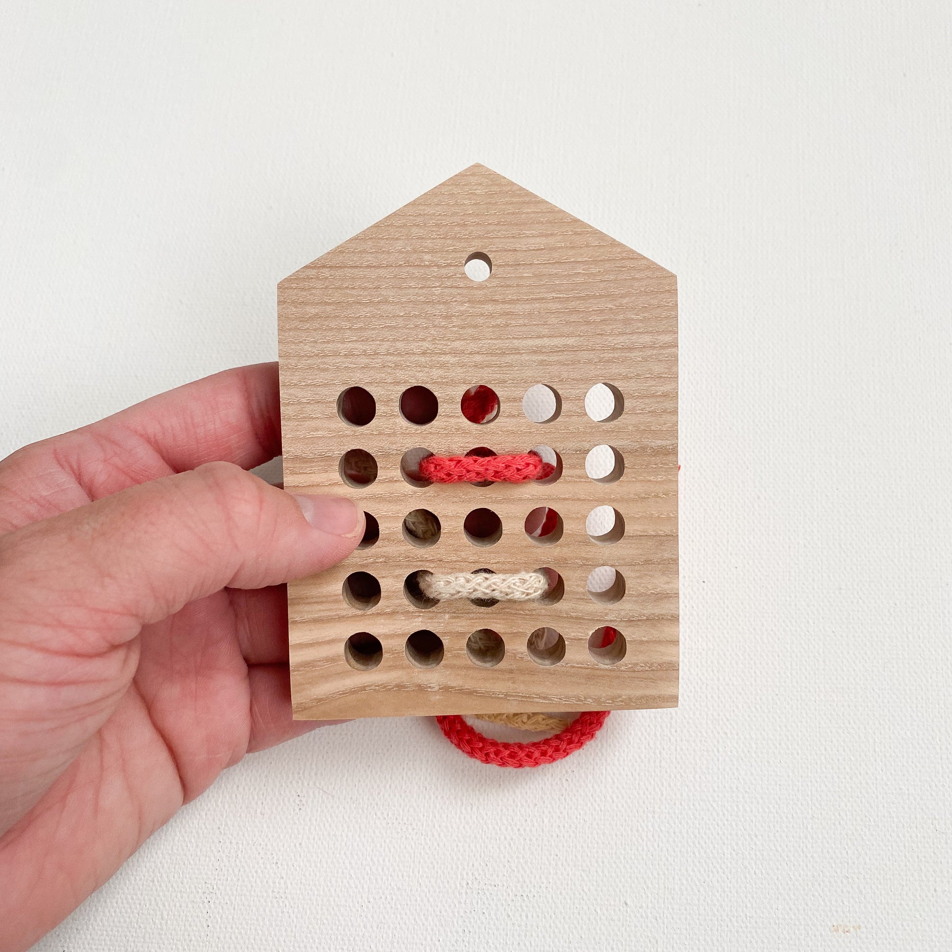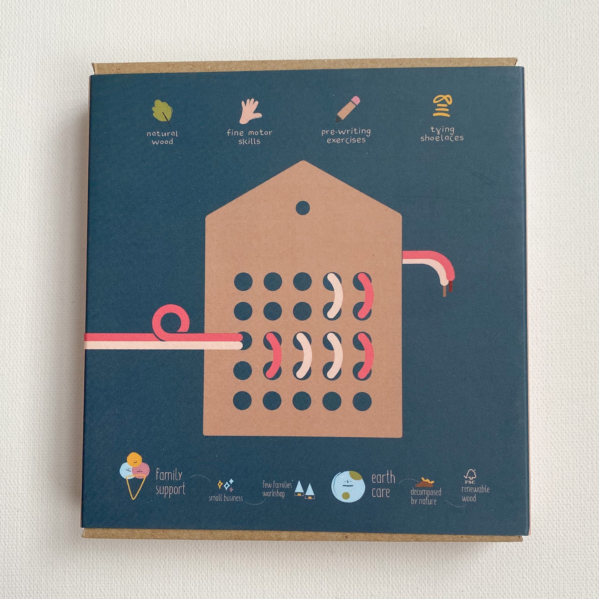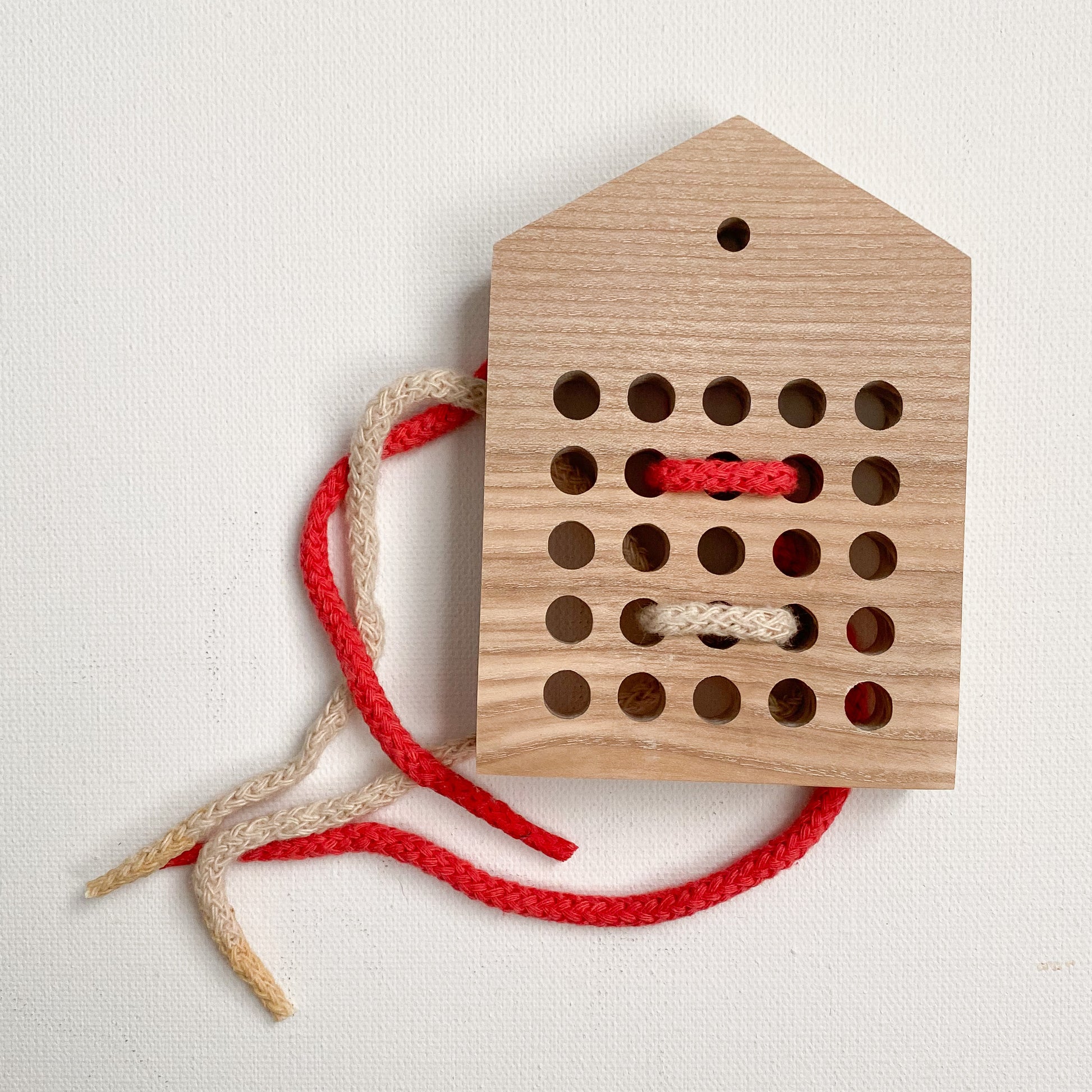 A sweet little wooden house lacing toy. There are 25 holes for endless combinations of lacing. Take on a car ride for entertainment if you need a break from screens. Develops fine motor skills, imagination, and creativity.