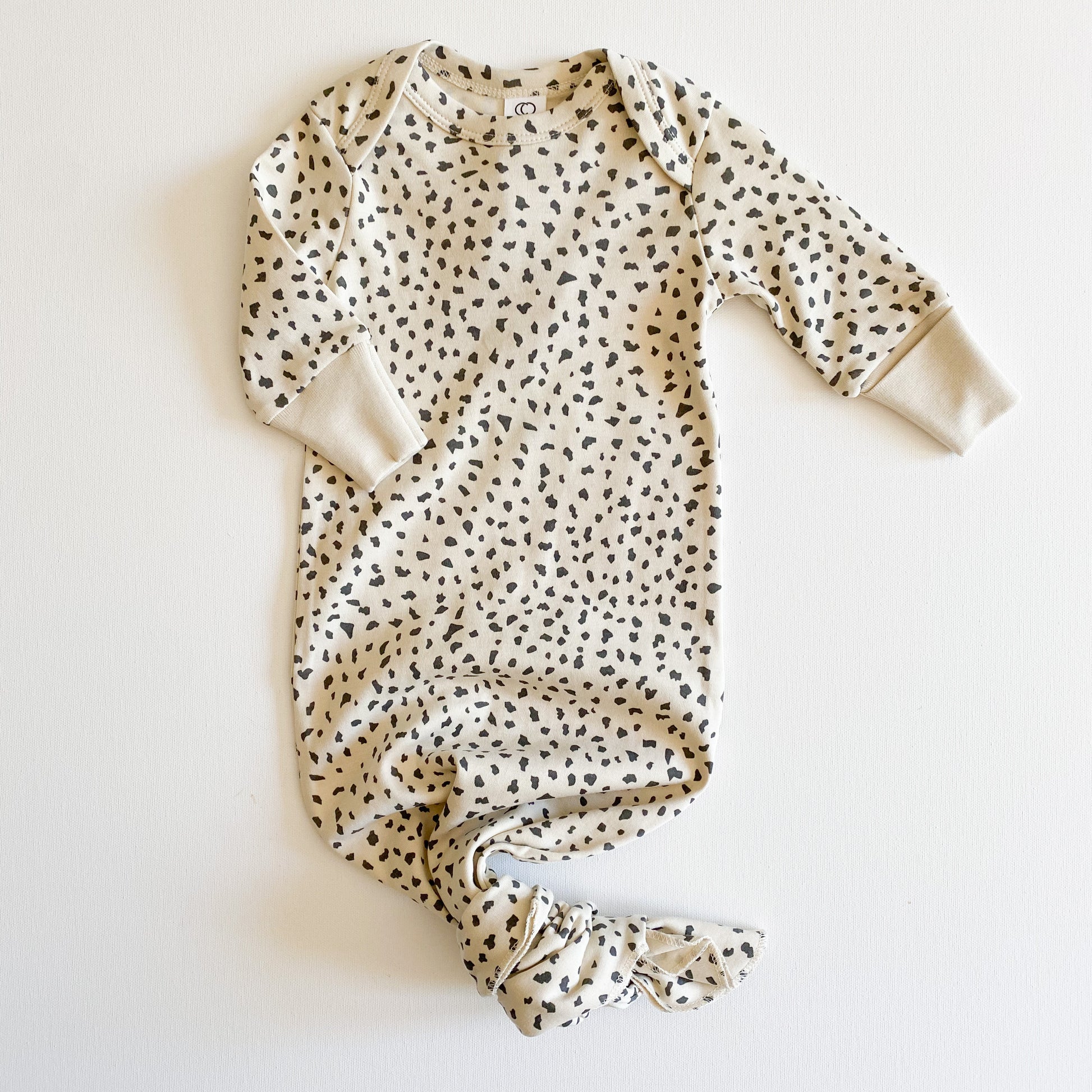 Organic cotton newborn gown with modern cheetah print. The arms have fold over cuffs, perfect for keeping baby from scratching themselves and keeping their little fingers warm. This gown also features folding shoulders for easy undressing and an adjustable tie bottom to fit the length you need.