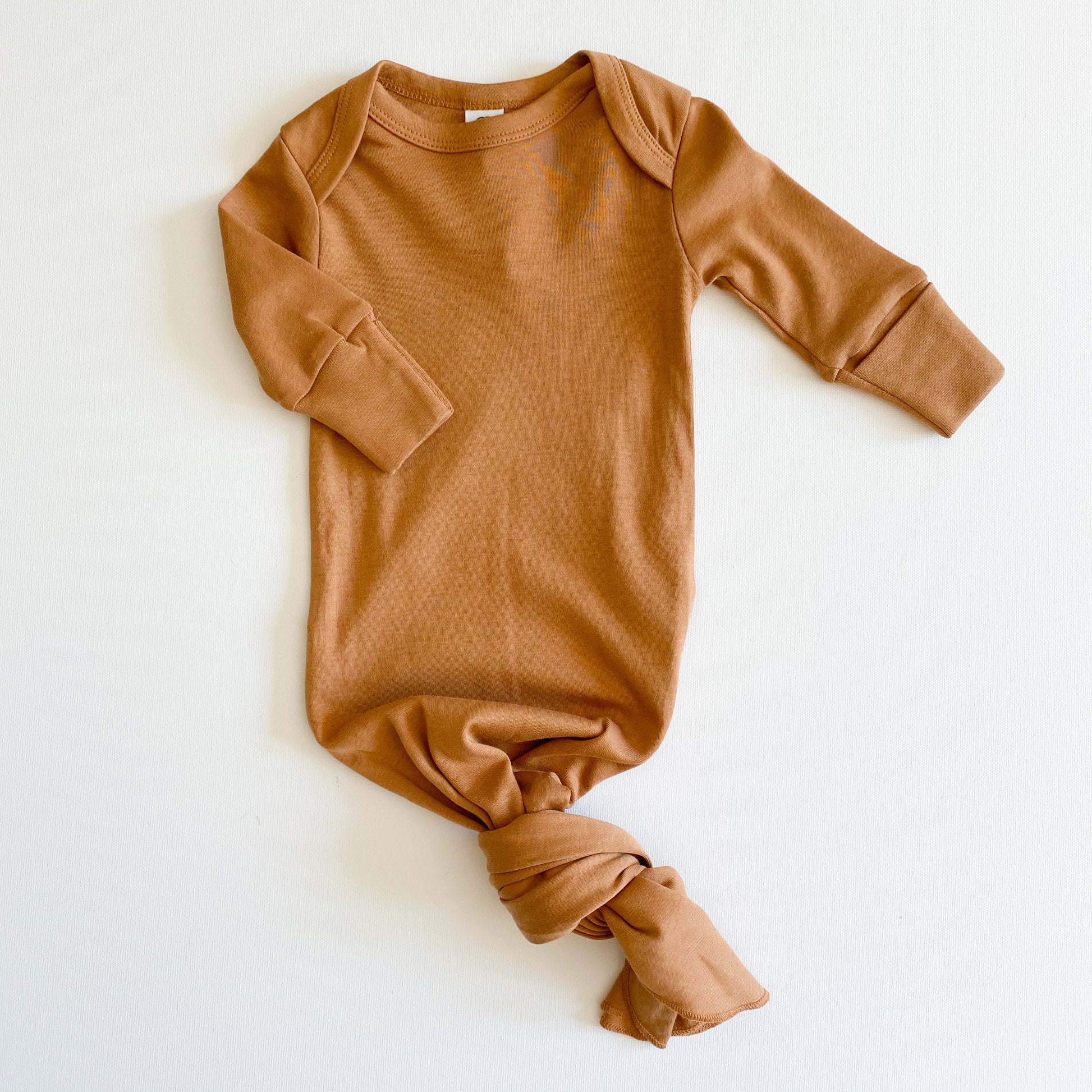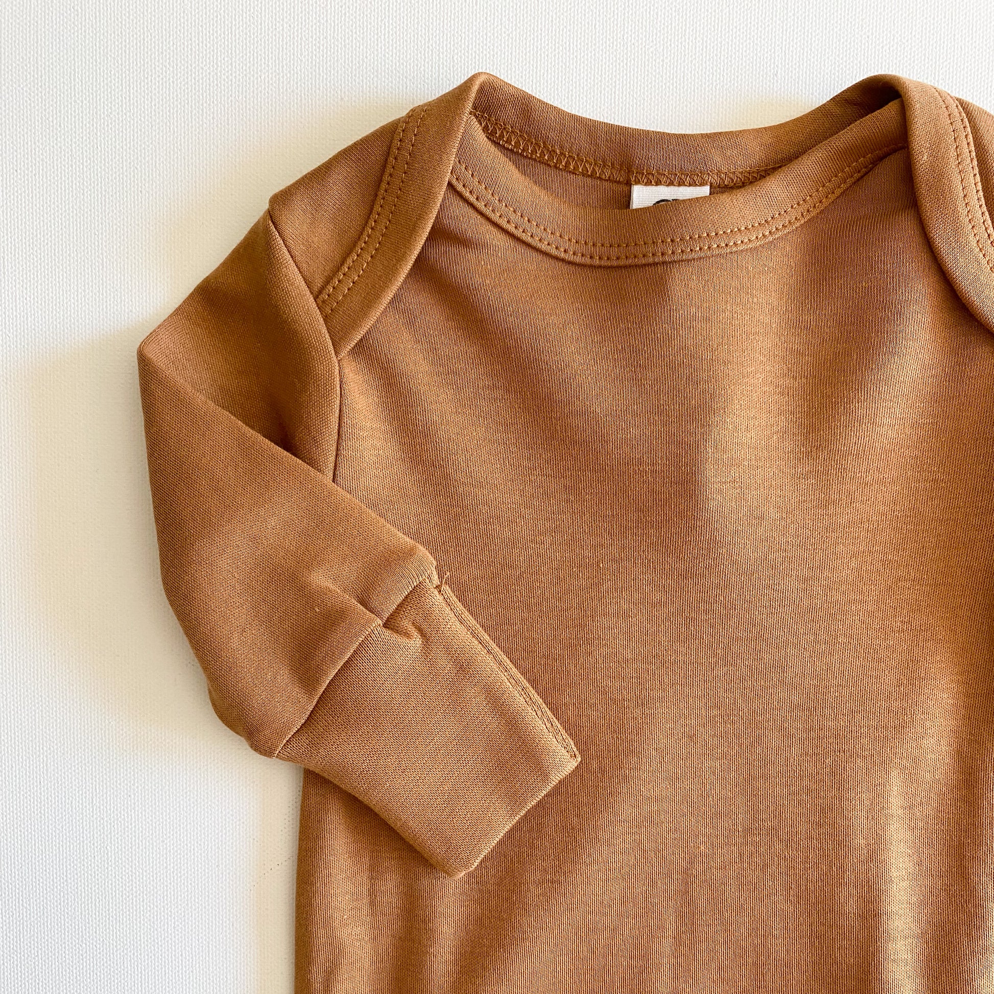 Organic cotton newborn gown in ginger. The arms have fold over cuffs, perfect for keeping baby from scratching themselves and keeping their little fingers warm. This gown also features folding shoulders for easy undressing and an adjustable tie bottom to fit the length you need.