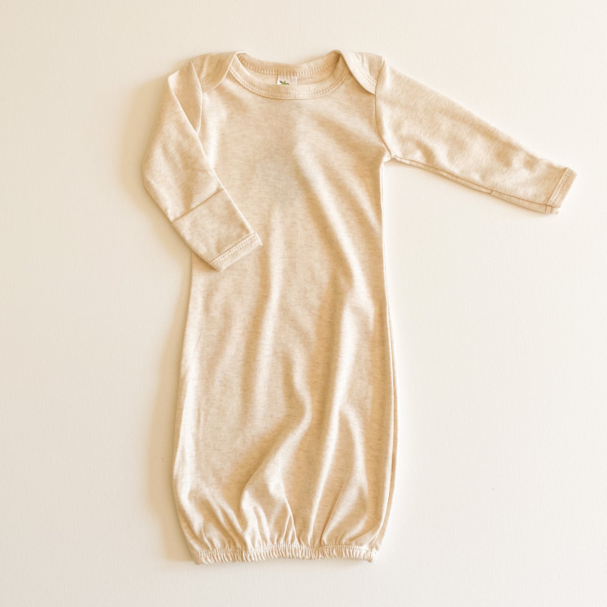 Newborn baby gown in a neutral oatmeal color. It has a gathered elastic bottom, making it easy to do diaper changes. The arms fold over if you need to keep baby's hands warm or keep them from scratching. Pair with a swaddle and lovey for a perfect welcome home baby gift!