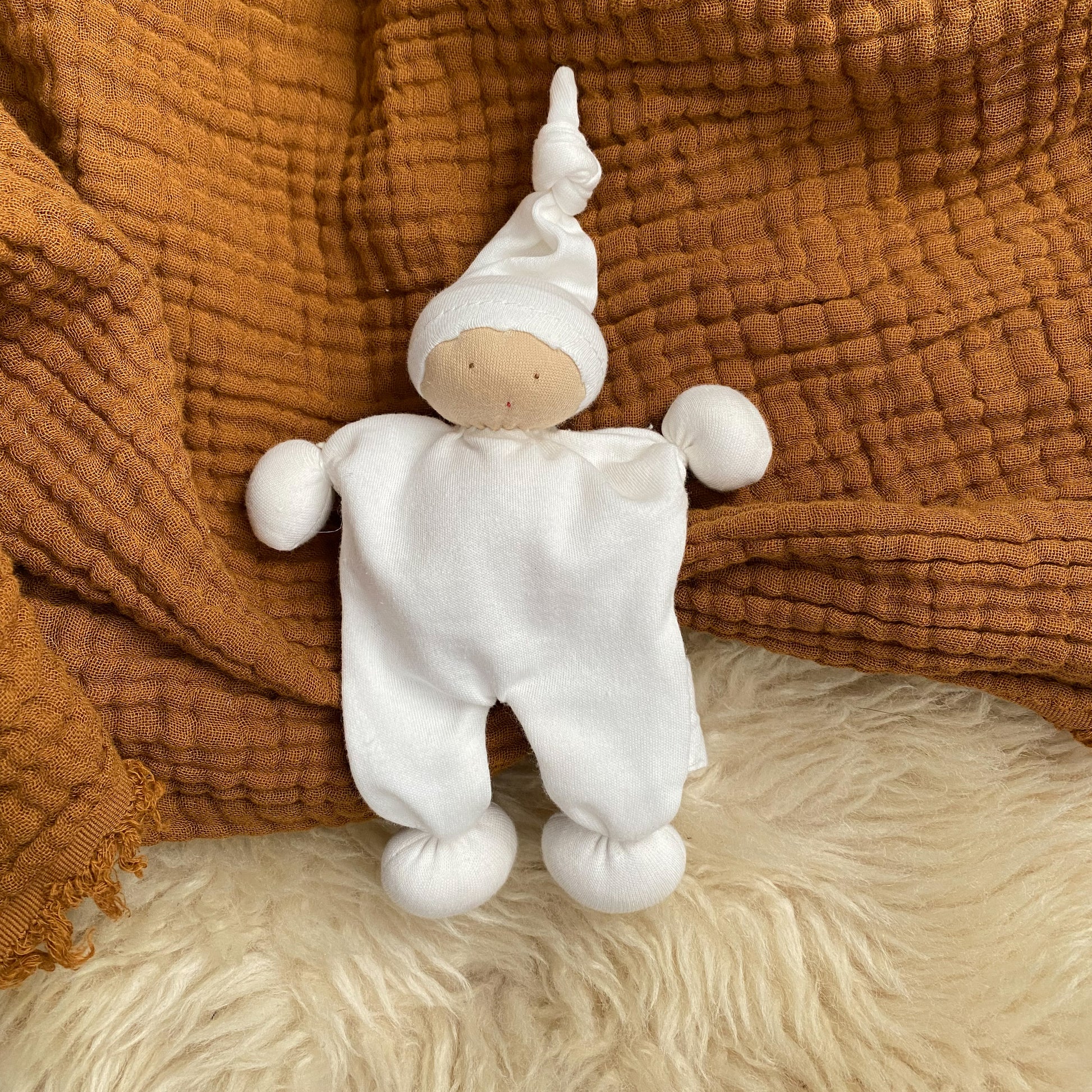 Adorable little organic baby buddy. This doll is the perfect size for little hands to grasp and squeeze. Made of 100% organic Egyptian cotton, this adorable little guy is sure to be a favorite snuggle buddy. Sustainably and ethically made in Egypt.