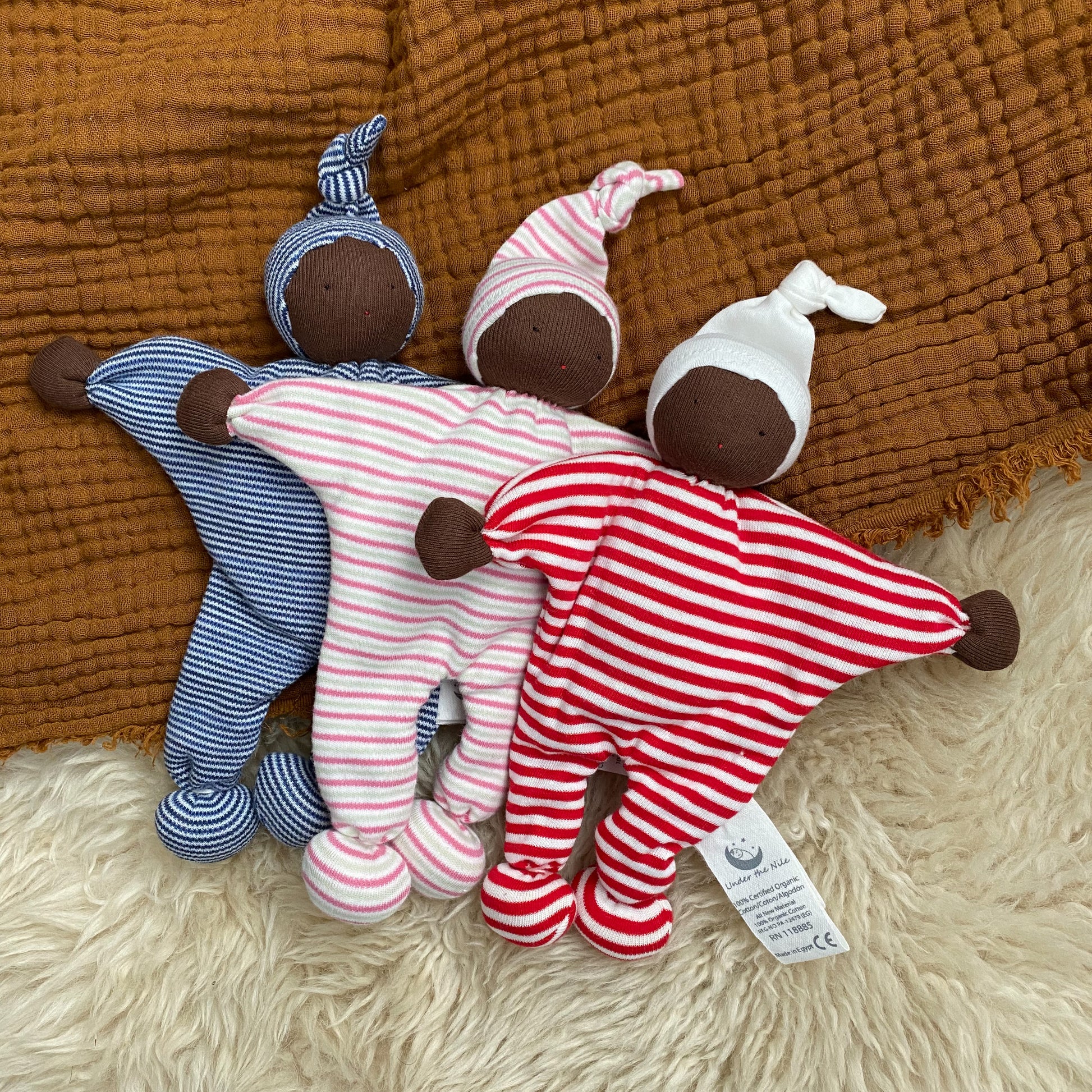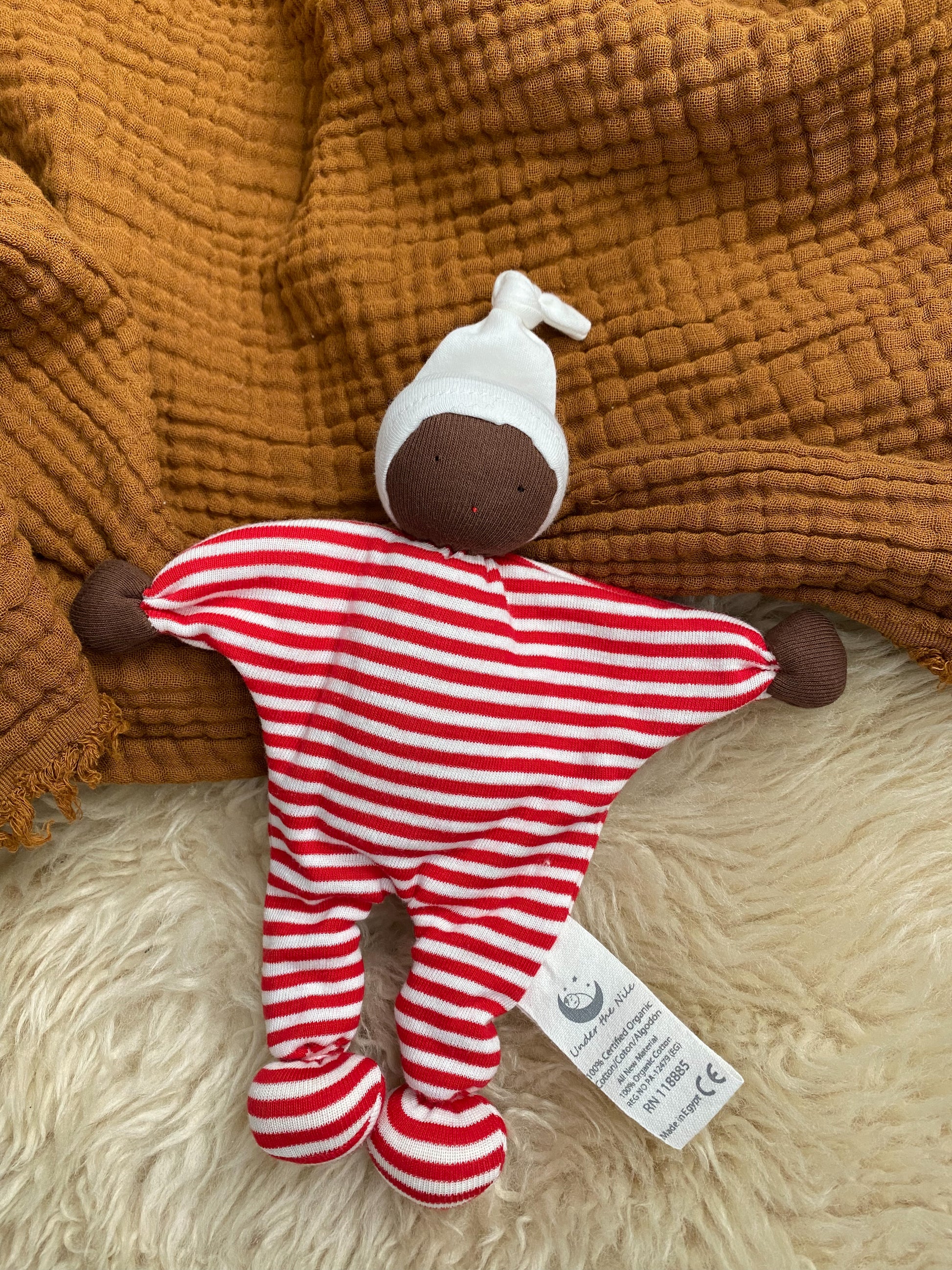 Adorable organic baby buddy. This doll is the perfect size for little hands to grasp and squeeze. Made of 100% organic Egyptian cotton, this adorable little guy is sure to be a favorite lovie of your little one. Sustainably and ethically made in Egypt. These dolls are a little bigger, ideal for babies and toddlers alike.
