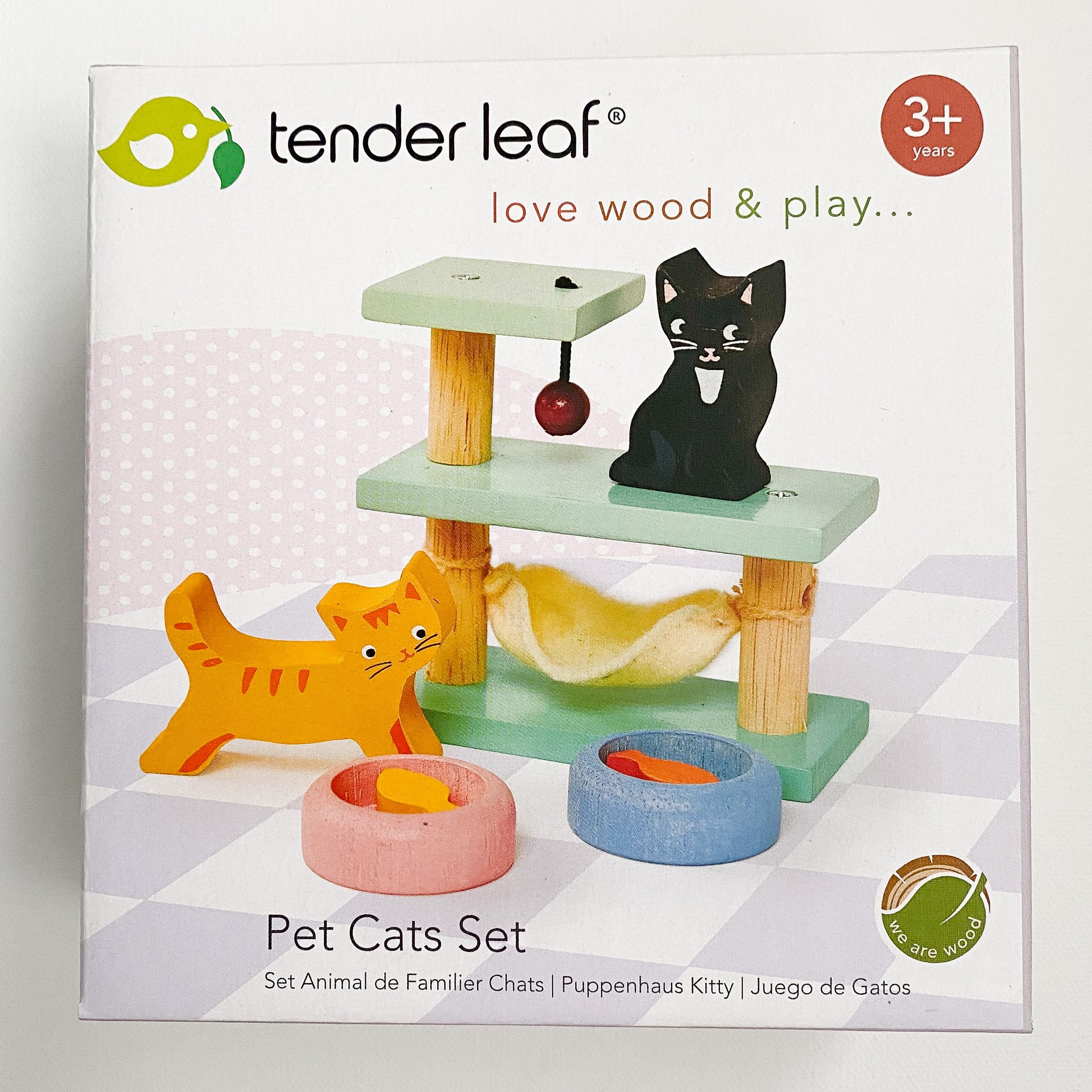 There's nothing kids love better than a miniature set! Your kiddo will love caring for and playing with these kitties. It makes for a perfect sized gift because it doesn't take up a lot of space and is easy to transport. Set comes with two cats, black and orange, a cat perch complete with a play batting toy and hammock, and two tasty bowls of fish!