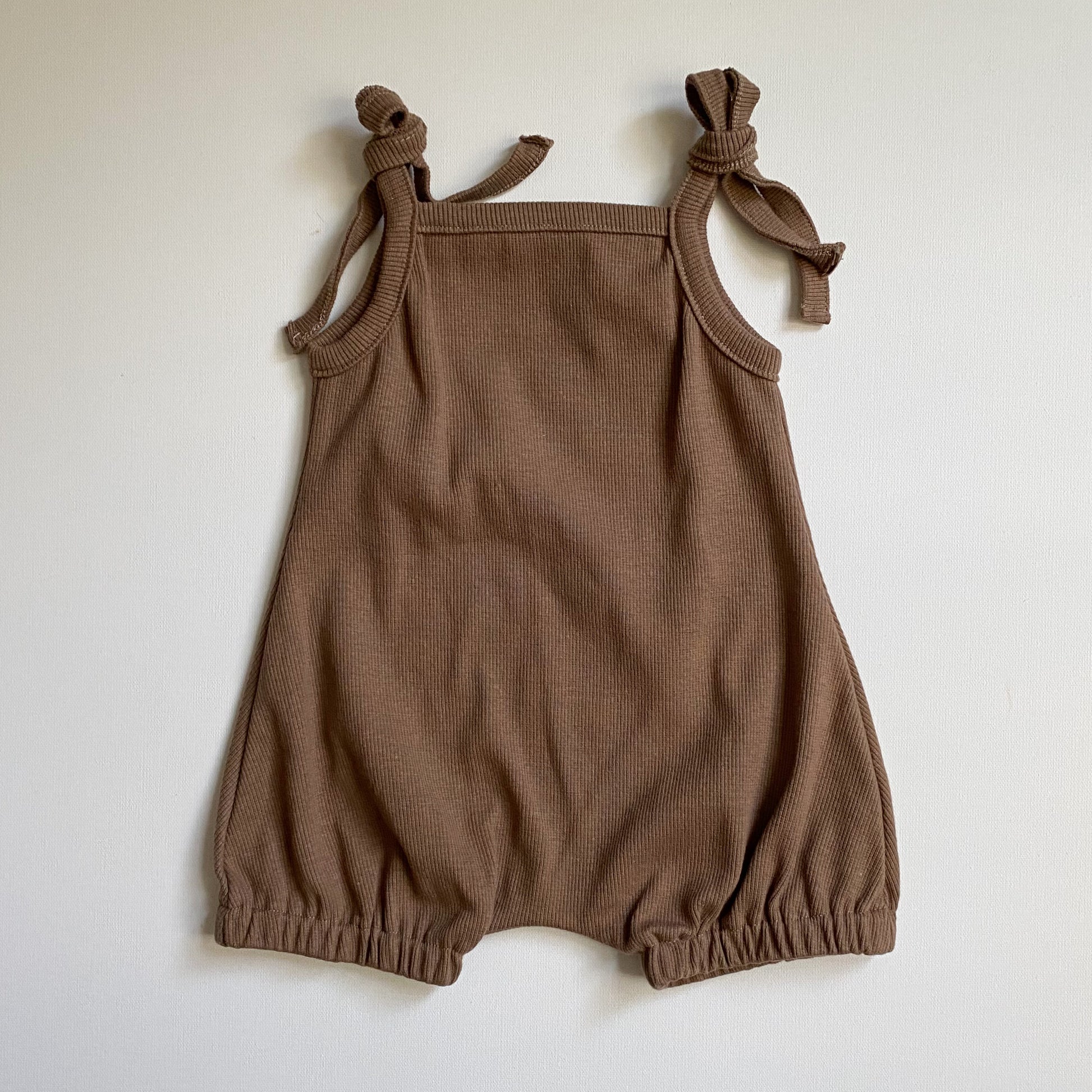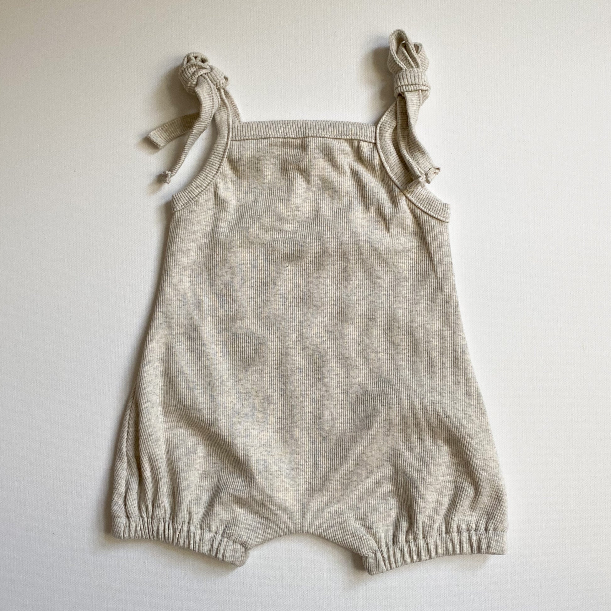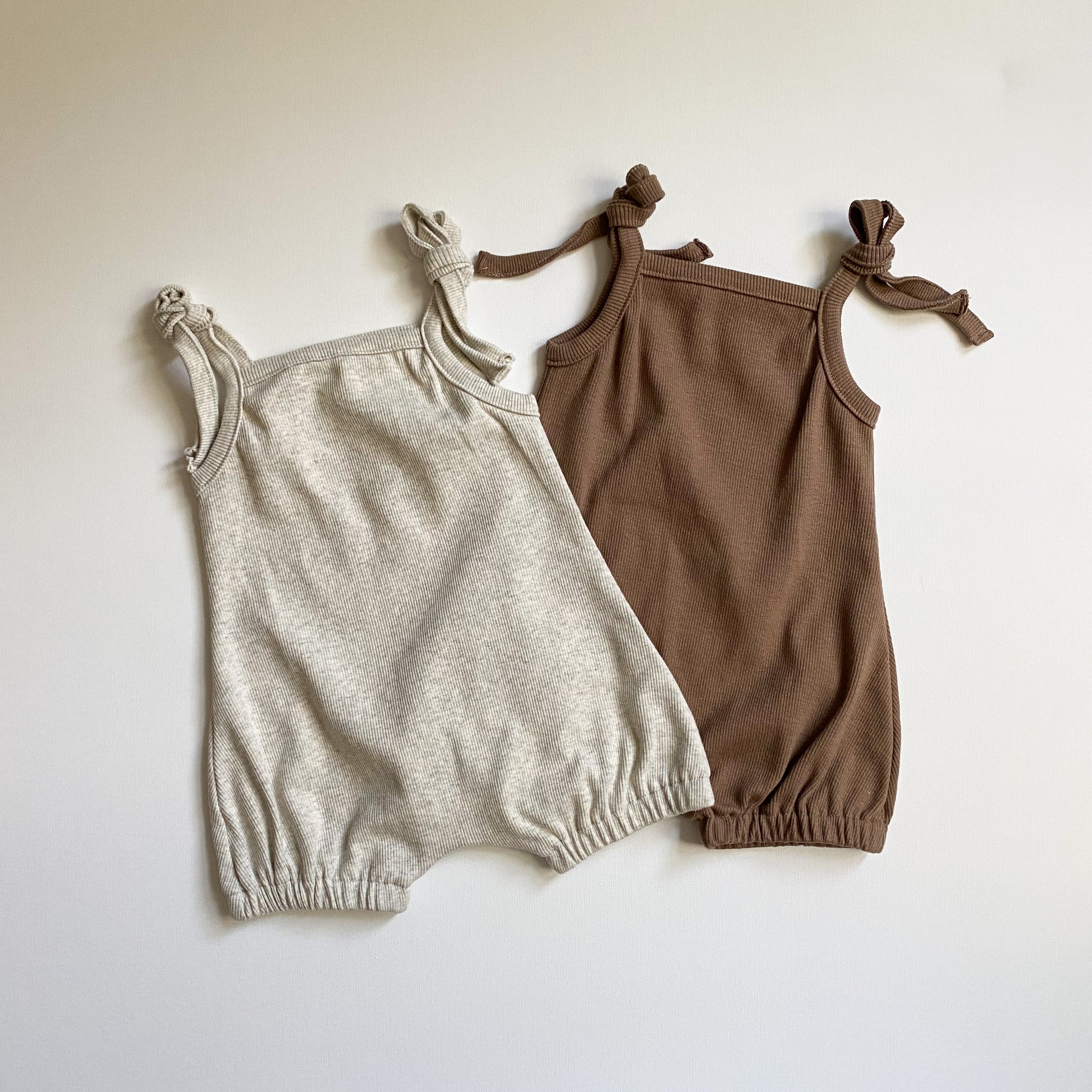 Adorable, ribbed baby jumpsuit in modern neutral colors. The fabric is durable and made to last. There is a tie at the shoulder, allowing it to adjust to your baby's length and allow for longer wear. There are snaps on the legs for easy dressing and diaper changes. Put on some sandals and your favorite sun hat and you're baby's ready for a day at the beach! These sweet rompers are made in the USA with organic cotton.
