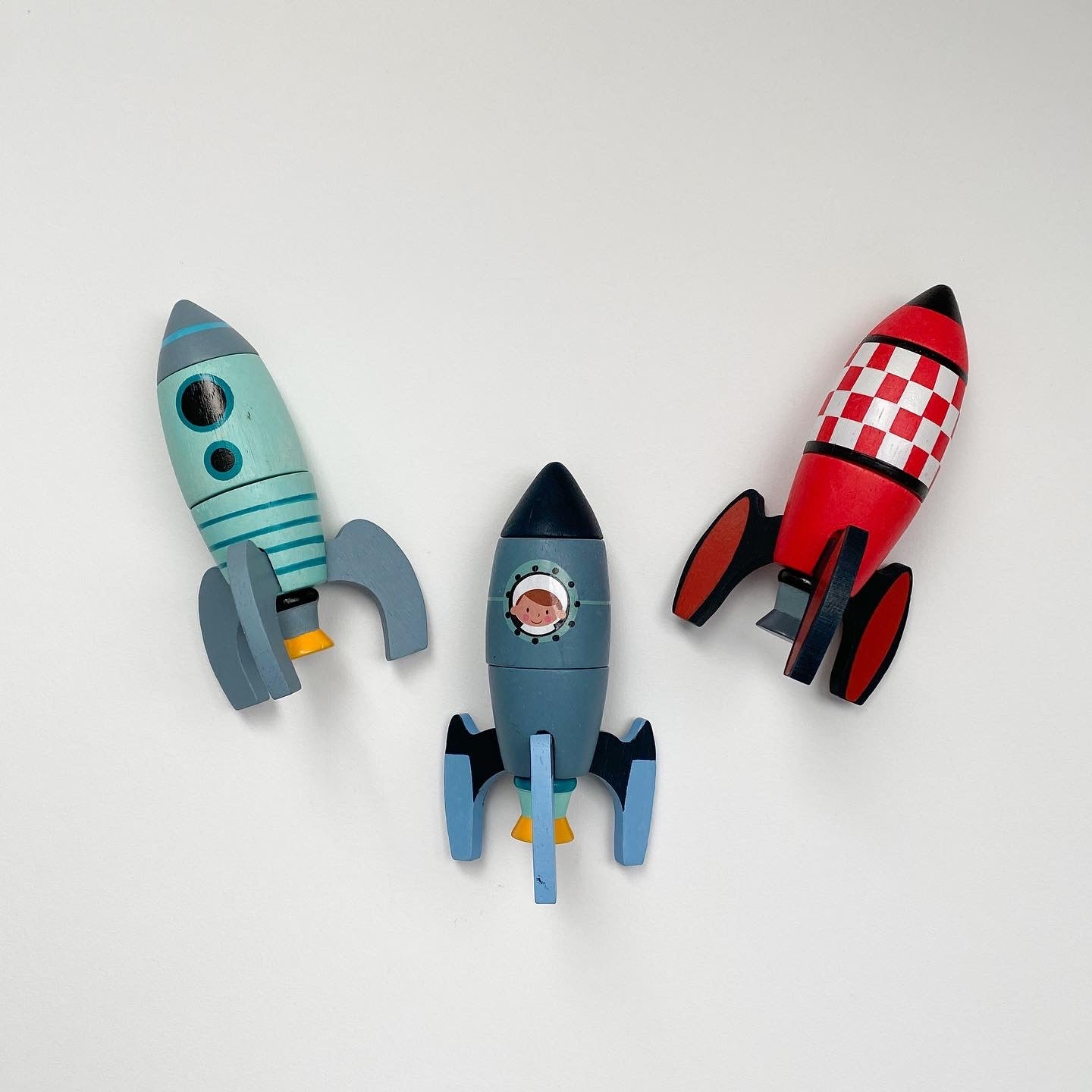 One of our most popular toys! Make your own rocket and blast off into space with this mix and match set of three. Made of sustainable rubber wood and painted with soft, non toxic colors. Your little one will have so much fun constructing and going on space adventures.