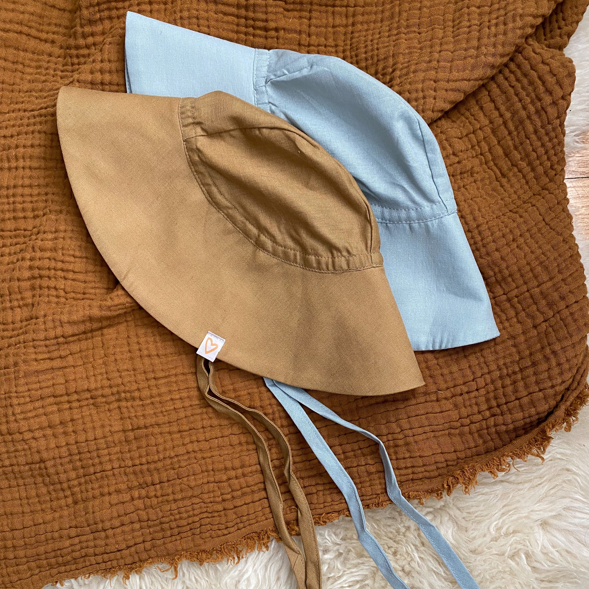 The sweetest wide brimmed sun hat! It has a tie for under the chin to ensure it stays on on windy days.
