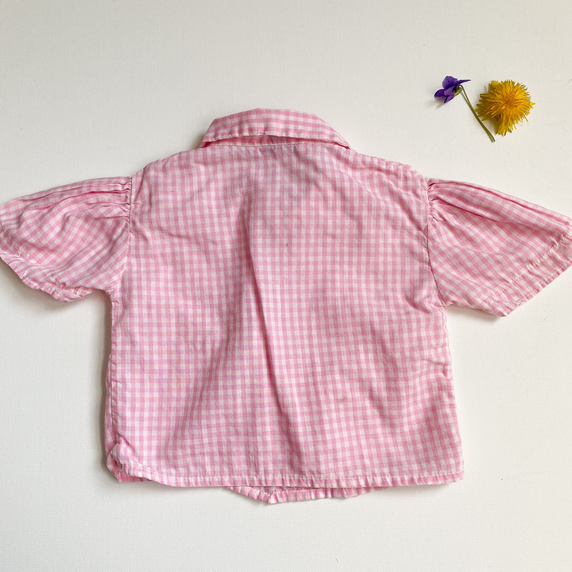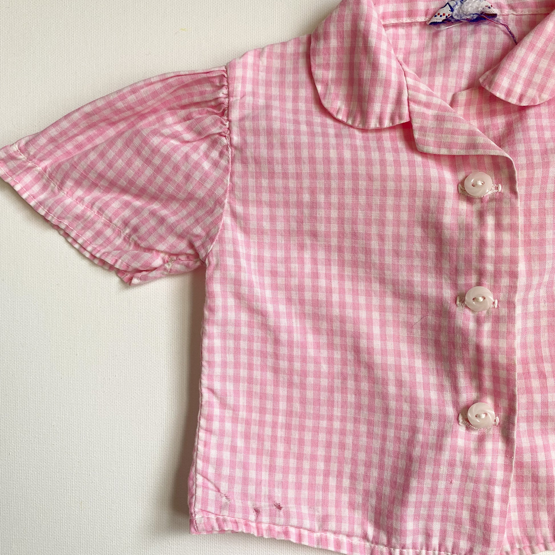 Sweet midcentury pink gingham button down with slight puff sleeves. It has a rounded collar and three buttons up the front. Tag says "Alber". There are some small holes in the fabric on the bottom of the shirt (pictured). There is no size on the tag, so read through the measurements. It looks about 6-12 months.