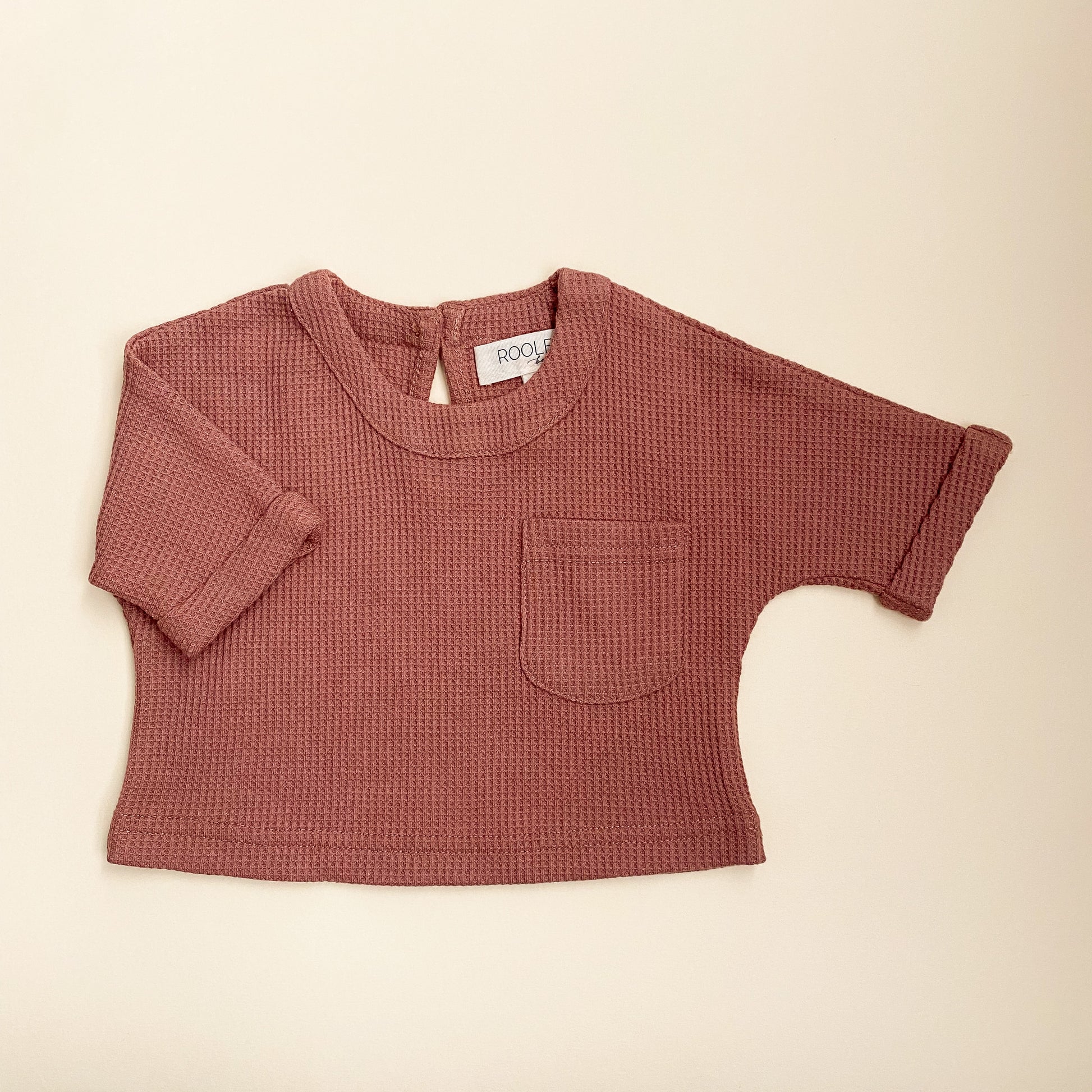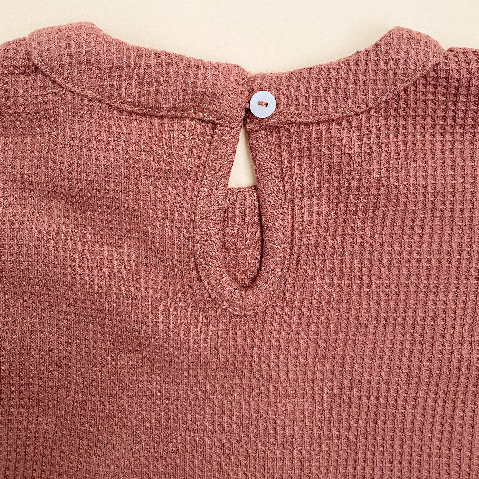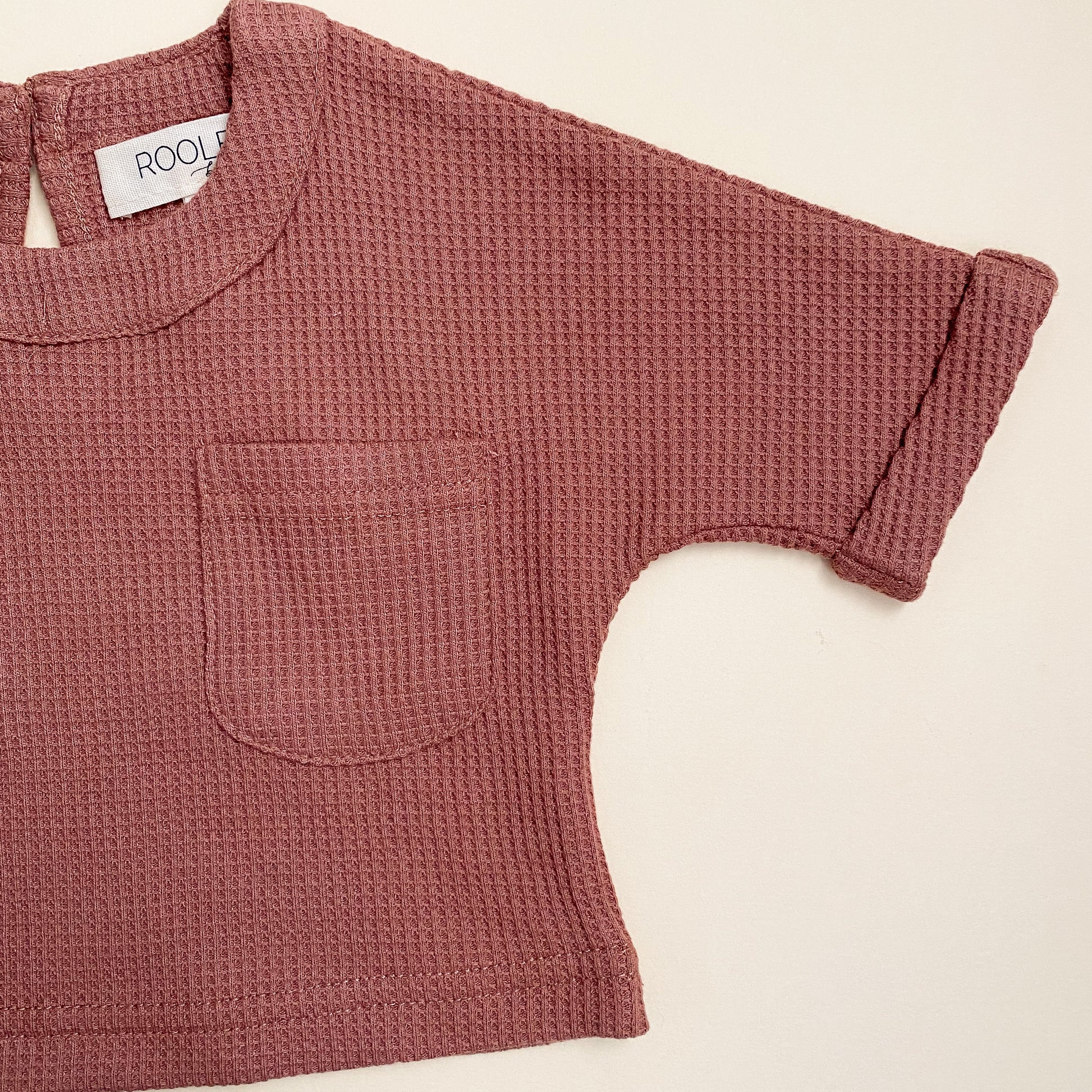 Cute waffle tee in dark salmon. It has a lovely sturdy texture, rolled sleeve detail, front pocket and a sweet keyhole button closure on the back. Pair with our classic joggers and minimalist beanie for a cool, casual look.